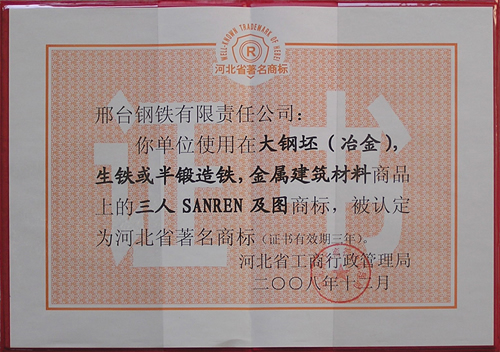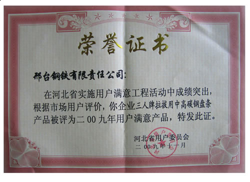 三人牌拉拔用中高碳鋼盤條被評為2009年河北省用戶滿意產品