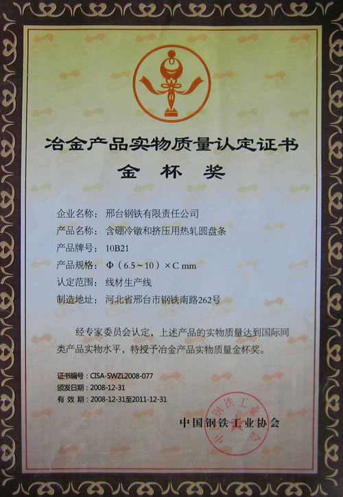 含硼冷鐓和冷擠壓用鋼盤條獲冶金產品實物質量金杯獎