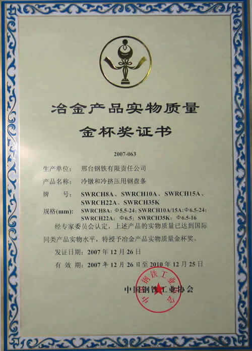 冷鐓和冷擠壓用鋼盤條SWRCH18A...SWRCH35K獲冶金產品實物質量金杯獎