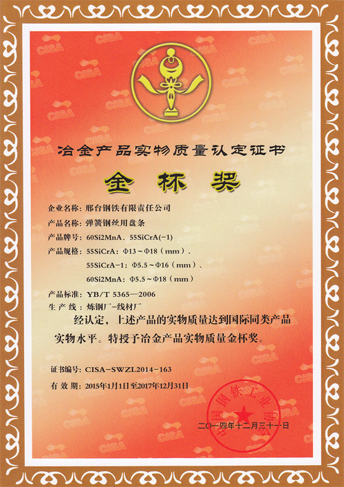 彈簧鋼絲用盤條60Si2MnA、55SiCrA(-1)獲冶金產(chǎn)品實物質量金杯獎
