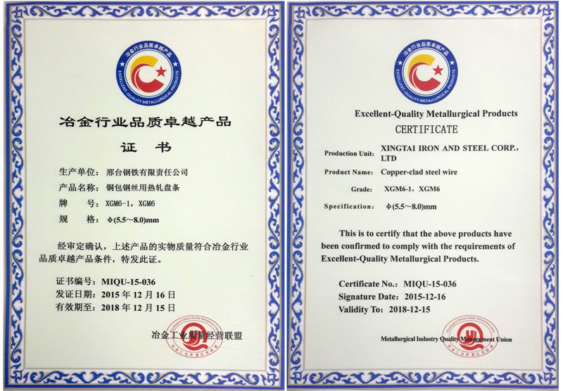 銅包鋼絲用熱軋盤條XGM6-1、XGM6φ(5.5~8.0)mm獲冶金行業(yè)品質卓越產(chǎn)品