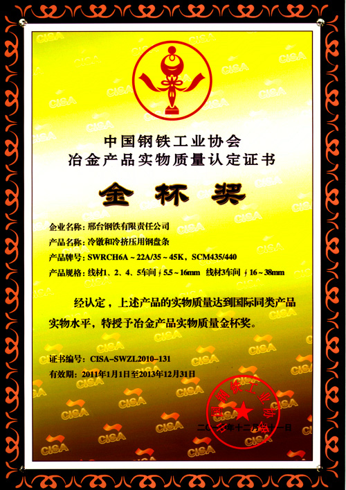 冷鐓和冷擠壓用鋼盤條SWRCH6A~22A/35~45K,SCM435/440獲冶金產(chǎn)品實(shí)物質(zhì)量金杯獎