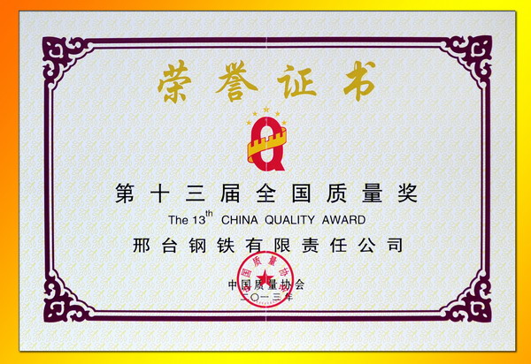2013年11月3日,由中國質(zhì)量協(xié)會組織舉辦的第十三屆全國追求卓越大會在北京召開,會議主題是“科學(xué)發(fā)展——實(shí)現(xiàn)有質(zhì)量的增長”。大會隆重舉行了全國質(zhì)量獎頒獎儀式,邢鋼董事長袁世臻、總經(jīng)理張永藏出席會議并上臺領(lǐng)取質(zhì)量管理的最高榮譽(yù)“全國質(zhì)量獎”。邢鋼也同時(shí)成為本屆11家全國質(zhì)量獎獲獎組織中唯一一家鋼鐵企業(yè)。