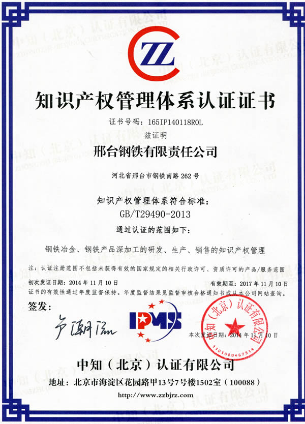 2014年11月10日,邢鋼通過GB/T29490-2013認(rèn)證,中知(北京)認(rèn)證有限公司向邢鋼頒發(fā)了《知識產(chǎn)權(quán)管理體系認(rèn)證證書》。