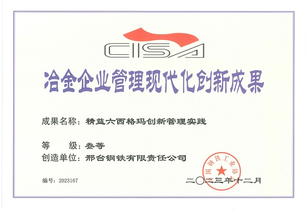 2023年12月,邢鋼《精益六西格瑪創(chuàng)新管理實(shí)踐》獲第二十一屆(2023年)冶金企業(yè)管理現(xiàn)代化創(chuàng)新成果獎(jiǎng)。