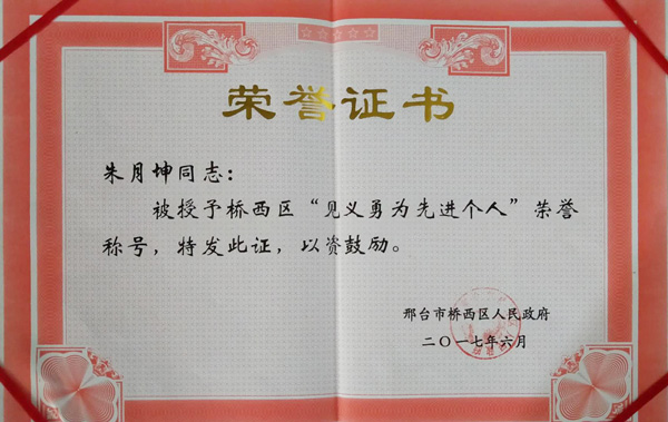 邢鋼質(zhì)量控制部朱月坤被授予邢臺市優(yōu)秀退役軍人榮譽稱號