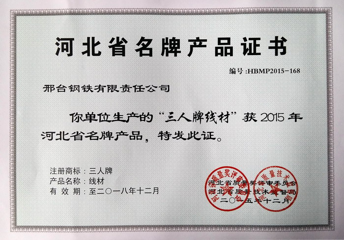 近日,邢鋼獲得了“河北省名牌產(chǎn)品”新證書,證書有效期至2018年12月。去年4月邢鋼按照河北省質(zhì)量技術(shù)監(jiān)督局的通知要求再次申報復評,提交了申報材料,經(jīng)邢臺市技術(shù)質(zhì)量監(jiān)督局推薦、第三方專業(yè)評價、用戶滿意度測評、省質(zhì)量獎評審委員會審議、社會公示并報請省政府批準,邢鋼“三人牌線材”再獲“河北省名牌產(chǎn)品”。