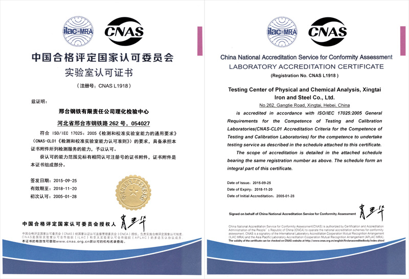 近日,邢鋼公司理化檢驗中心順利通過CNAS中國合格評定認可委員會第三次復評審,獲得新版實驗室認可證書,證書注冊號:CNAS L1918,有效期至2018年11月20日。