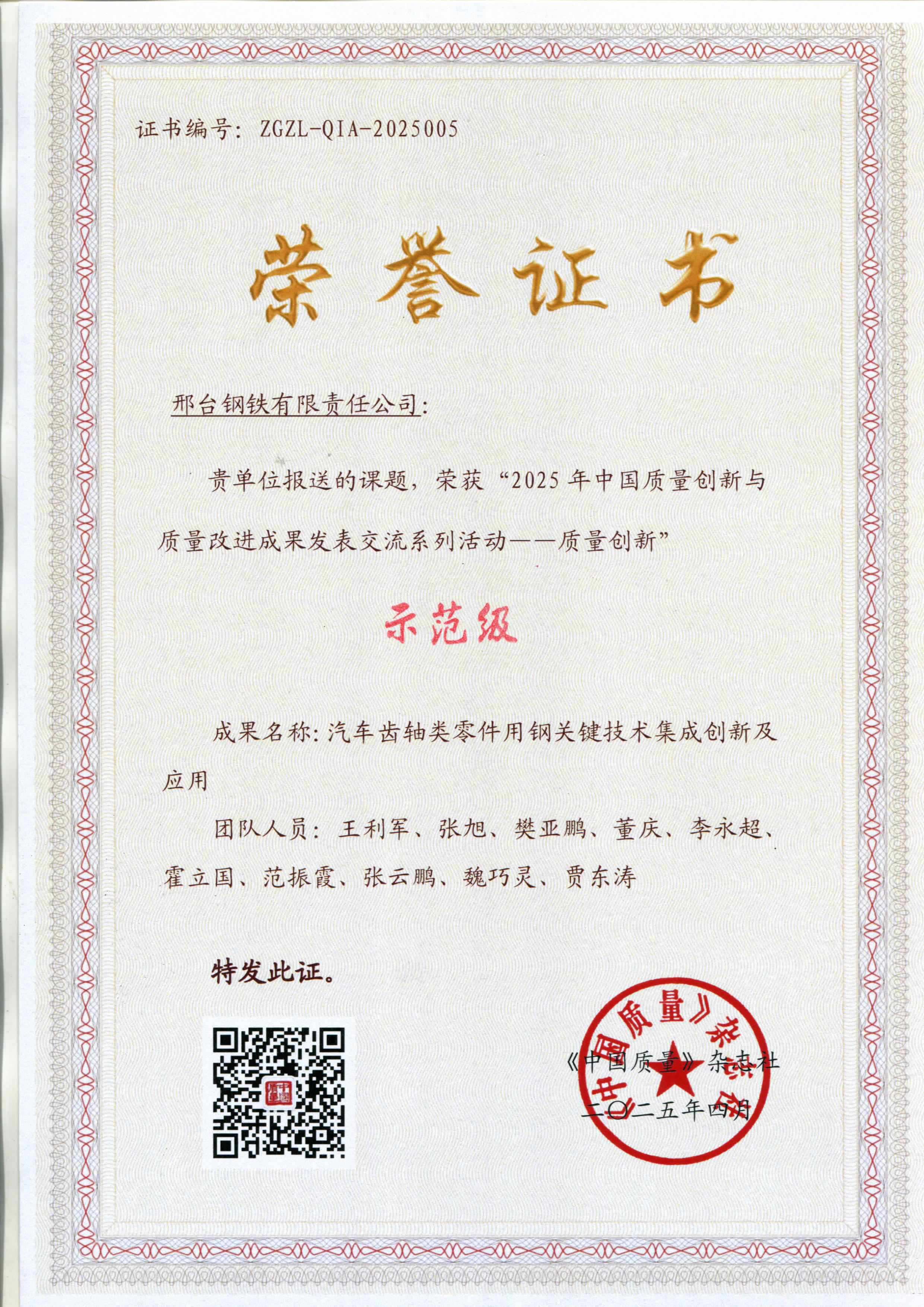 邢臺鋼鐵有限責(zé)任公司(以下簡稱“邢鋼”)申報的《汽車齒軸類零件用鋼關(guān)鍵技術(shù)集成創(chuàng)新及應(yīng)用》項目,憑借其顯著的創(chuàng)新性、實用性和示范性,從眾多參評成果中脫穎而出,榮獲“示范級”最高獎項。
