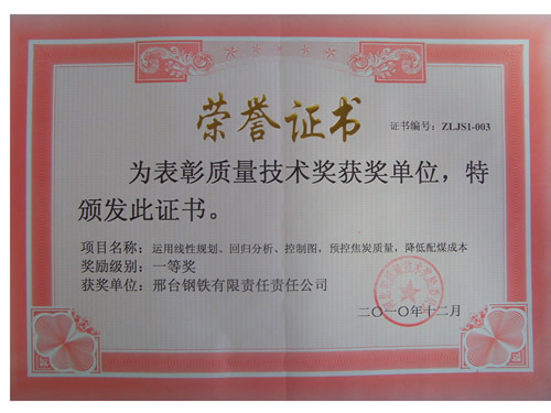 近日獲悉,我公司申報的“運用線性規(guī)劃、回歸分析、控制圖預(yù)控焦炭質(zhì)量,降低配煤成本”質(zhì)量技術(shù)成果,經(jīng)河北省質(zhì)量技術(shù)獎勵委員會評選,獲得一等獎。該項目是焦化廠運用質(zhì)量統(tǒng)計技術(shù)工具經(jīng)過實踐取得的一項質(zhì)量技術(shù)成果。通過實施該項目,配合煤成本比2008年降低了4775萬元,保持了焦炭質(zhì)量的持續(xù)穩(wěn)定。