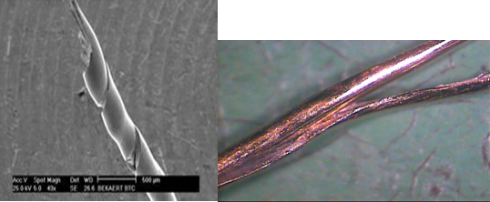 主要是指鋼絲在Bunching機(jī)器中由于鋼絲的塑性不夠,在扭轉(zhuǎn)時造成鋼絲呈螺旋狀分層斷裂,這主要發(fā)生在粗規(guī)格以及高強(qiáng)度直徑上。