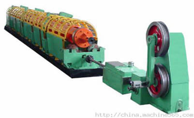 卷線:將鋼絲線盤,重新卷在捻股機(jī)的工字輪上;也可將鋼絲從拔絲機(jī)后直接卷到工字輪上;捻股:將鋼絲捻成繩股。捻股機(jī)有筐籃式、軸管式、無管式和雙捻機(jī)等。圖3為12軸管式捻股機(jī)示意圖,1是裝下層繩股的工字輪,2是旋轉(zhuǎn)的機(jī)筒,內(nèi)裝12個(gè)卷滿鋼絲的工字輪,3是成股的壓線瓦,4是牽引輪,5是上層繩股的收線輪,機(jī)筒旋轉(zhuǎn)一周,牽引輪引出的繩股長度即為股的捻距。