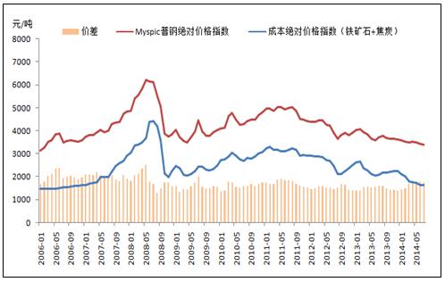 鋼鐵行業(yè)的原材料主要是鐵礦石和焦炭,近期原材料和鋼材的價(jià)格一直處于下跌狀態(tài)。截止2014年8月12日中國的焦炭絕對價(jià)格指數(shù)為931.8元/噸,同比下降19.33%;鐵礦石的絕對價(jià)格指數(shù)為699元/濕噸,同比下降27.55%;Myspic普鋼絕對價(jià)格指數(shù)為3380.68元/噸,同比下降9.8%,原材料價(jià)格下降速度遠(yuǎn)大于鋼鐵。