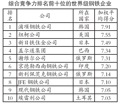 浦項(xiàng)鋼鐵公司在技術(shù)工人熟練程度、技術(shù)創(chuàng)新能力、聯(lián)盟與合資、所在國家風(fēng)險(xiǎn)等方面獲得10分的滿分,但在獲取鐵礦石、煉焦煤等煉鋼原料和能源成本、國內(nèi)市場趨于飽和等方面存在明顯短板,得分也相對較低,該公司以加權(quán)平均7.91分(滿分為10分)繼續(xù)位居榜首,與去年得分相比沒有變化。