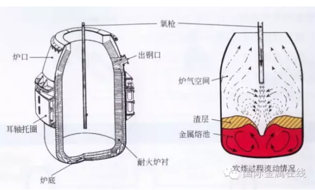 爐料通常為鐵水、廢鋼和造渣材料;也可加入少量冷生鐵和鐵礦石。通過氧槍從熔池上面向下吹入高壓的純氧(含O299.5%以上),氧化去除鐵水中的硅、錳、碳和磷等元素,并通過造渣進(jìn)行脫磷和脫硫。各種元素氧化所產(chǎn)生的熱量,加熱了熔池的液態(tài)金屬,使鋼水達(dá)到現(xiàn)定的化學(xué)成分和溫度。它主要用于冶煉非合金鋼和低合金鋼;但通過精煉手段,也可用于冶煉不銹鋼等合金鋼。