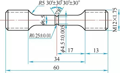 第三,試樣的制造。按圖沿材料的順纖維方向加工試樣,粗加工后熱處理至所要求的抗拉強度,然后精加工至規(guī)定尺寸,缺口用中軟細粒氧化鋁砂輪磨制。磨削時應保證缺口根部半徑圓滑。磨削后投影檢查,確保缺口尺寸符合圖紙要求。逐根測量缺口根部直徑(圖中為φ4.5?0.05mm)的尺寸,并做好編號記錄。