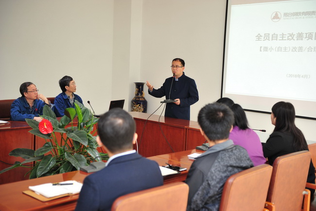 公司全員自主改善精益項目顧問楊智公司聶昌浩作了輔導(dǎo)講話和業(yè)務(wù)培訓(xùn)。重點指出了邢鋼做好全員自主改善項目的重要意義;強調(diào)自主改善工作要不斷優(yōu)化,長期堅持;各級管理者要正確引導(dǎo),把無序的工作變?yōu)橛行虻母纳疲桓骷壴u審委員會在做好評審工作的基礎(chǔ)上,要重點做好改善方向的引導(dǎo)。