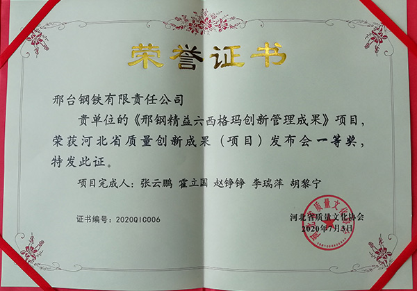 為激發(fā)萬眾創(chuàng)新熱情,提高創(chuàng)新質(zhì)量,促進(jìn)創(chuàng)新交流,河北省質(zhì)量文化協(xié)會于2020年7 月2日至3日在石家莊召開了河北省第三屆質(zhì)量創(chuàng)新成果(項(xiàng)目)發(fā)布會。經(jīng)申報(bào)材料評審,大會發(fā)表,專家評審,邢臺鋼鐵有限責(zé)任公司申報(bào)的4項(xiàng)質(zhì)量創(chuàng)新成果(項(xiàng)目)全部獲獎。