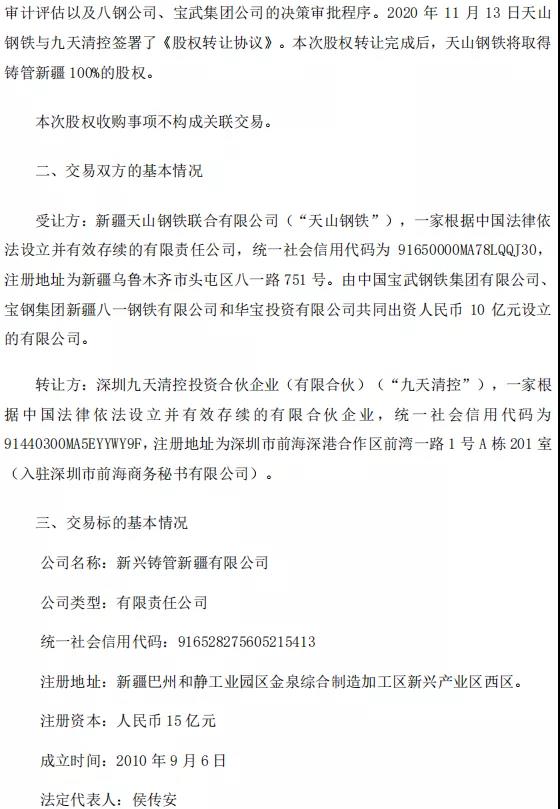 11月13日晚間,八一鋼鐵發(fā)布公告稱,該公司控股股東寶鋼集團新疆八一鋼鐵有限公司的控股子公司新疆天山鋼鐵聯(lián)合有限公司擬受讓深圳九天清控投資合伙企業(yè)持有的新興鑄管新疆有限公司100%股權(quán)。11月13日,天山鋼鐵與九天清控簽署了《股權(quán)轉(zhuǎn)讓協(xié)議》。本次股權(quán)轉(zhuǎn)讓以2019年12月31日為基準日,以公司經(jīng)天健會計師事務(wù)所審計、北京中企華資產(chǎn)評估有限責(zé)任公司評估后的100%股權(quán)價值為基礎(chǔ),各方協(xié)商確定本次股權(quán)轉(zhuǎn)讓價款為21.81億元。