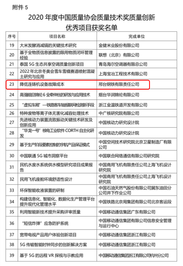 近日,從中國質(zhì)量協(xié)會獲悉,前期經(jīng)中質(zhì)協(xié)推薦,邢鋼公司申報的《降低連鑄機設(shè)備故障成本》項目榮獲“2020年度中國質(zhì)量協(xié)會質(zhì)量技術(shù)獎質(zhì)量創(chuàng)新優(yōu)秀項目獎”,邢鋼公司作為唯一的鋼鐵企業(yè)榮登獲獎名單。