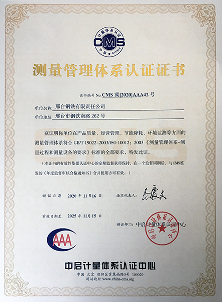 近日,邢臺(tái)鋼鐵有限責(zé)任公司(以下簡(jiǎn)稱邢鋼)收到中啟認(rèn)證中心頒發(fā)的《測(cè)量管理體系認(rèn)證證書》,證書編號(hào)CMS冀【2020】AAA42號(hào),證書有效期至2025年11月15日,證書的獲得標(biāo)志著邢鋼測(cè)量體系認(rèn)證證書順利實(shí)現(xiàn)換版。