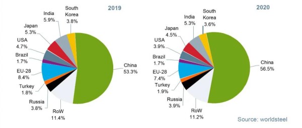 2020年,中國粗鋼產量達到10.53億噸,同比提高5.2%。中國粗鋼產量占全球粗鋼產量的份額,由2019年53.3%上升到2020年的56.5%。