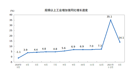 2021年3月份,規(guī)模以上工業(yè)增加值同比實(shí)際增長(zhǎng)14.1 %(以下增加值增速均為扣除價(jià)格因素的實(shí)際增長(zhǎng)率)。從環(huán)比看,3月份,規(guī)模以上工業(yè)增加值比上月增長(zhǎng)0.60%。一季度,規(guī)模以上工業(yè)增加值同比增長(zhǎng)24.5%;比2019年同期增長(zhǎng)14.0%,兩年平均增長(zhǎng)6.8%。