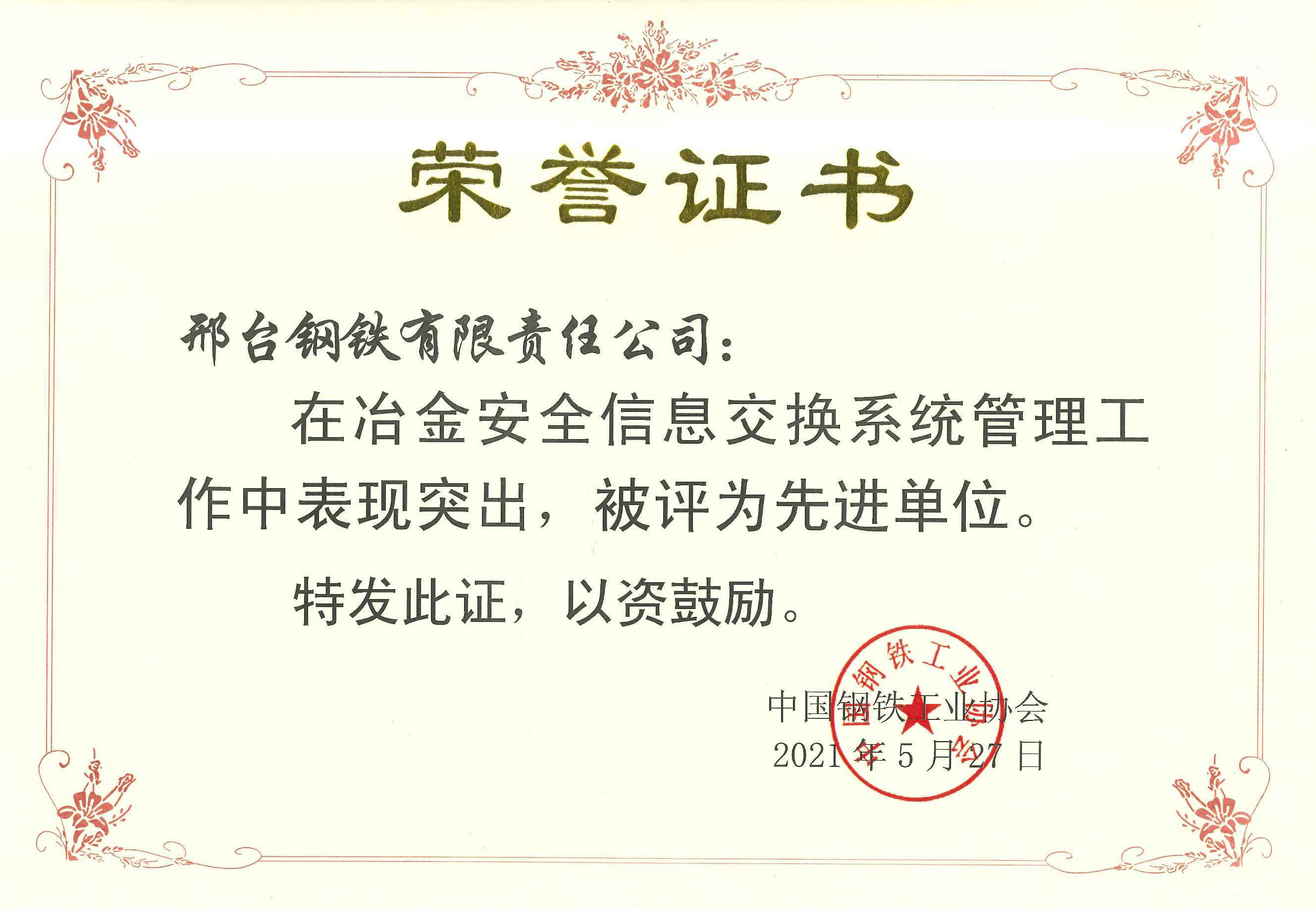 近日,邢臺鋼鐵有限責(zé)任公司(以下簡稱邢鋼)收到中鋼協(xié)〔2021〕73 號文《關(guān)于表彰冶金安全信息交換系統(tǒng)管理工作先進(jìn)單位和先進(jìn)個(gè)人的決定》及榮譽(yù)證書,邢鋼在冶金安全信息交換系統(tǒng)管理工作中表現(xiàn)突出,被評為先進(jìn)單位。