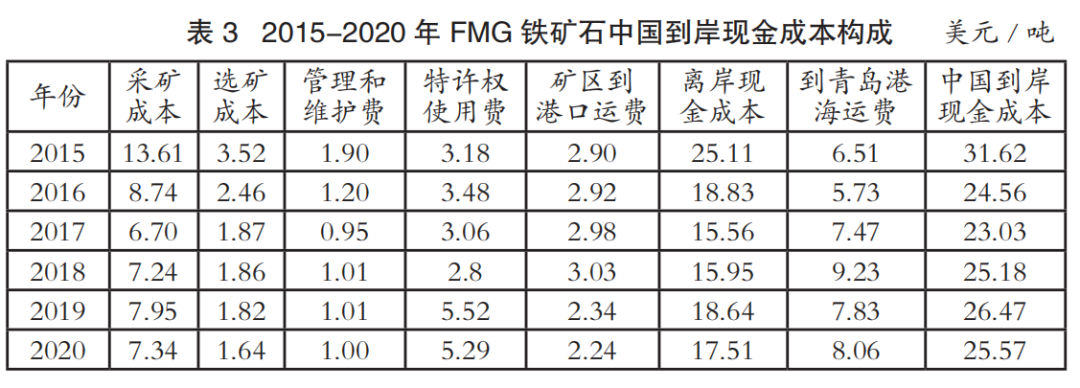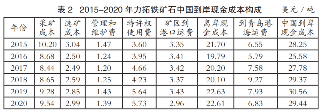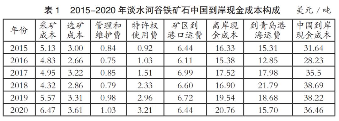 中國(guó)進(jìn)口鐵礦石到岸成本主要由離岸現(xiàn)金成本和海運(yùn)成本兩部分構(gòu)成。表1至表4為2015-2020年國(guó)際四大礦鐵礦石中國(guó)到岸現(xiàn)金成本構(gòu)成情況(數(shù)據(jù)來源:AME),其中離岸現(xiàn)金成本由采礦成本、選礦成本、管理和維護(hù)費(fèi)、特許權(quán)使用費(fèi)和礦區(qū)到港口運(yùn)費(fèi)構(gòu)成;中國(guó)到岸現(xiàn)金成本由離岸現(xiàn)金成本和到青島港海運(yùn)費(fèi)構(gòu)成;該成本數(shù)據(jù)僅為現(xiàn)金成本,不含國(guó)際四大礦的融資、折舊費(fèi)用。