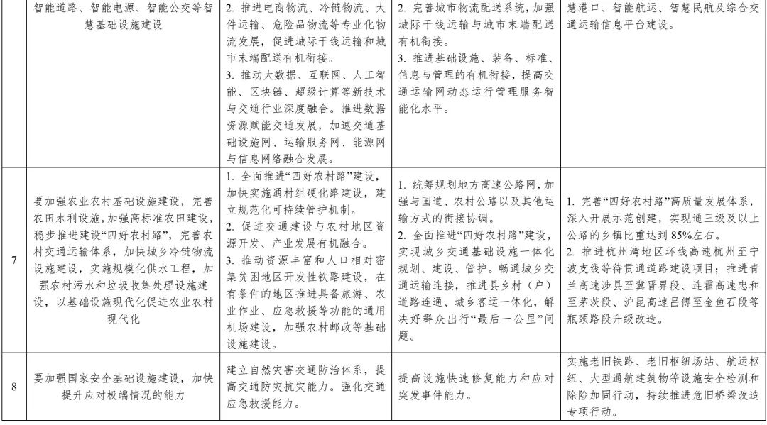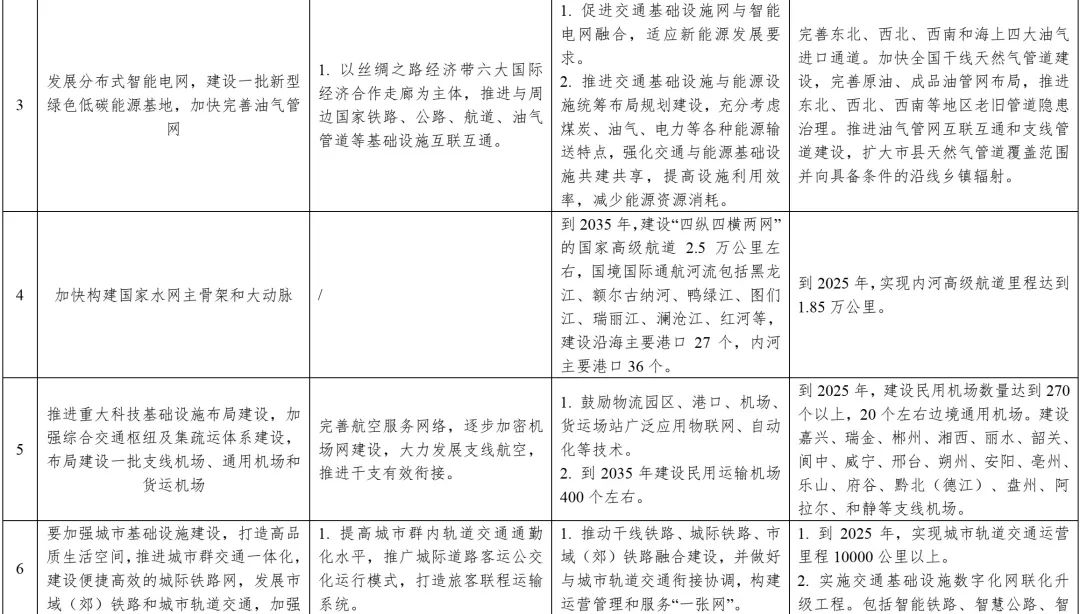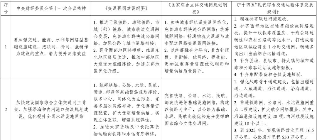 中央財經(jīng)委員會第十一次會議要求內(nèi)容與中共中央、國務(wù)院印發(fā)的《交通強國建設(shè)綱要》《國家綜合立體交通網(wǎng)規(guī)劃綱要》《“十四五”現(xiàn)代綜合交通運輸體系發(fā)展規(guī)劃》等政策文件一脈相承,并有所側(cè)重,強化了交通、能源、水利、城鎮(zhèn)和科技等基礎(chǔ)設(shè)施在國內(nèi)國際雙循環(huán)相互促進過程中的重要紐帶作用和產(chǎn)業(yè)鏈供應(yīng)鏈安全穩(wěn)定的保障基石作用,對構(gòu)建現(xiàn)代化基礎(chǔ)設(shè)施體系、推動經(jīng)濟高質(zhì)量發(fā)展具有重要指導(dǎo)意義。同時,兼顧了有序推進地下綜合管廊建設(shè),加強城市防洪排澇、污水和垃圾收集處理體系建設(shè),加強防災(zāi)減災(zāi)基礎(chǔ)設(shè)施、公共衛(wèi)生應(yīng)急設(shè)施和國家安全基礎(chǔ)設(shè)施建設(shè);推進重點水源、灌區(qū)、蓄滯洪區(qū)建設(shè)和現(xiàn)代化改造等內(nèi)容。表1為中央財經(jīng)委員會第十一次會議基礎(chǔ)設(shè)施建設(shè)有關(guān)內(nèi)容與相關(guān)政策文件對照。