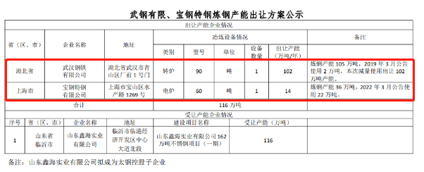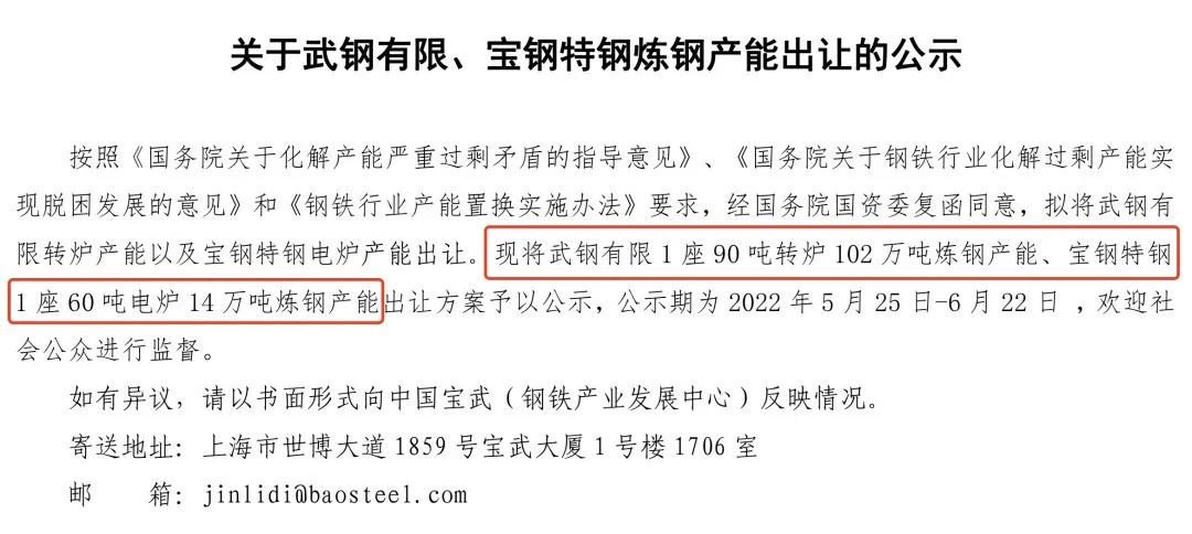 按照《國務(wù)院關(guān)于化解產(chǎn)能嚴(yán)重過剩矛盾的指導(dǎo)意見》、《國務(wù)院關(guān)于鋼鐵行業(yè)化解過剩產(chǎn)能實現(xiàn)脫困發(fā)展的意見》和《鋼鐵行業(yè)產(chǎn)能置換實施辦法》要求,經(jīng)國務(wù)院國資委復(fù)函同意,擬將武鋼有限轉(zhuǎn)爐產(chǎn)能以及寶鋼特鋼電爐產(chǎn)能出讓。現(xiàn)將武鋼有限1座90噸轉(zhuǎn)爐102萬噸煉鋼產(chǎn)能、寶鋼特鋼1座60噸電爐14萬噸煉鋼產(chǎn)能出讓方案予以公示,公示期為2022年5月25日-6月22日,歡迎社會公眾進(jìn)行監(jiān)督。