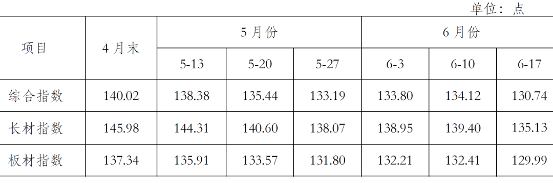 5月末,CSPI長材指數(shù)為138.07點(diǎn),環(huán)比下降7.91點(diǎn),降幅為5.42%;CSPI板材指數(shù)為131.80點(diǎn),環(huán)比下降5.54點(diǎn),降幅為4.03%。與上年同期相比,長材、板材指數(shù)分別下降9.58點(diǎn)和11.48點(diǎn),降幅分別為6.49%和8.01%。(見下表)
