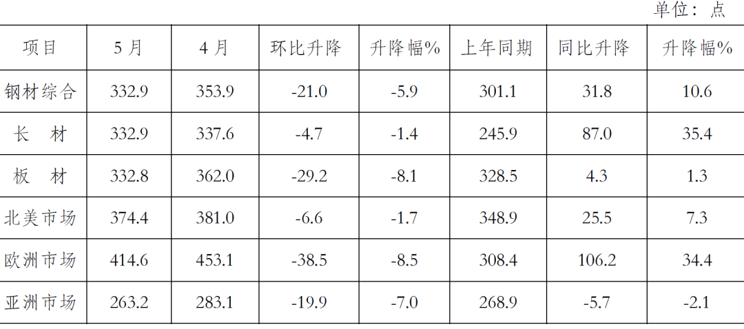 5月份,CRU國際鋼材價格指數(shù)為332.9點(diǎn),環(huán)比下降21.0點(diǎn),降幅為5.9%;同比上升31.8點(diǎn),升幅為10.6%。(見下圖)