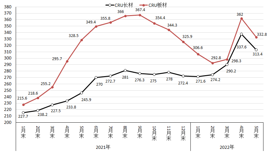 5月份,CRU長材指數(shù)為313.4點(diǎn),環(huán)比下降4.7點(diǎn),降幅為1.4%;CRU板材指數(shù)為332.8點(diǎn),環(huán)比下降29.2點(diǎn),降幅為8.1%,比長材降幅高2.2個百分點(diǎn);與去年同期相比,CRU長材指數(shù)同比上升87.0點(diǎn),升幅為35.4%;CRU板材指數(shù)同比上升4.3點(diǎn),升幅為1.3%。(見下圖)