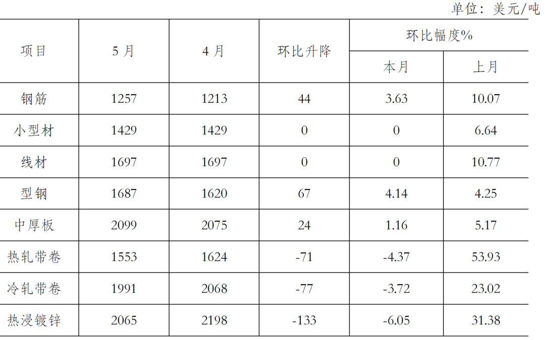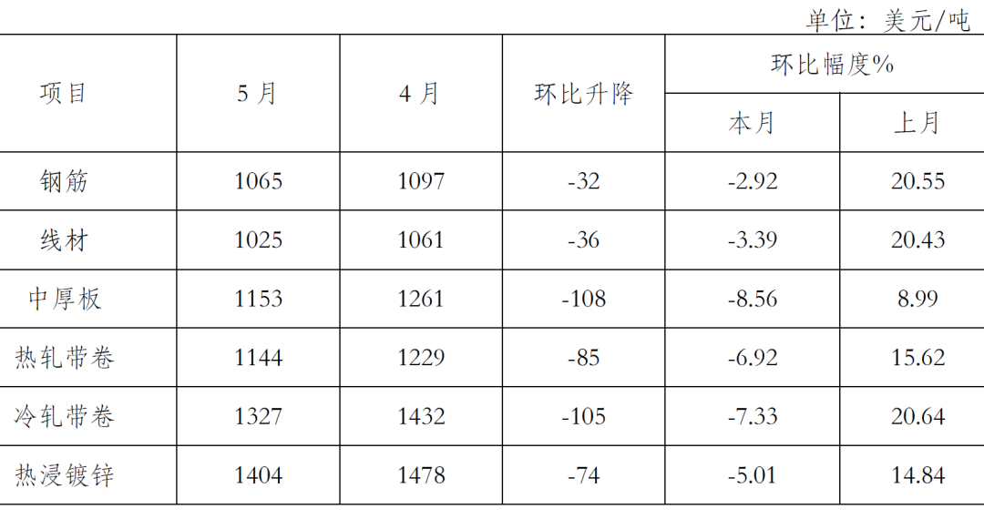 5月份,鋼鐵產(chǎn)量持續(xù)環(huán)比增長。吉林,上海等疫情嚴(yán)重地區(qū)開始復(fù)工復(fù)產(chǎn)、國家穩(wěn)增長政策相繼出臺,對需求的拉動還不明顯,國內(nèi)市場鋼材需求增長不及預(yù)期,加上鋼鐵生產(chǎn)環(huán)比增長,以及原燃材料價格在前期大漲后有所回落,致使鋼材價格呈小幅下行走勢。