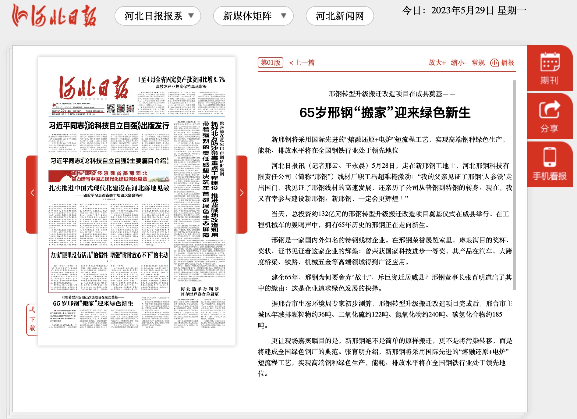 河北日報訊(記者邢云、王永晨)5月28日,走在新邢鋼工地上,河北邢鋼科技有限責(zé)任公司(簡稱“邢鋼”)線材廠職工馮超難掩激動:“我的父親見證了邢鋼‘人參鐵’走出國門,我見證了邢鋼線材的高速發(fā)展,還親歷了公司從普鋼到特鋼的轉(zhuǎn)身?,F(xiàn)在,我又有幸參與建設(shè)新邢鋼。新邢鋼,一定會更輝煌!”