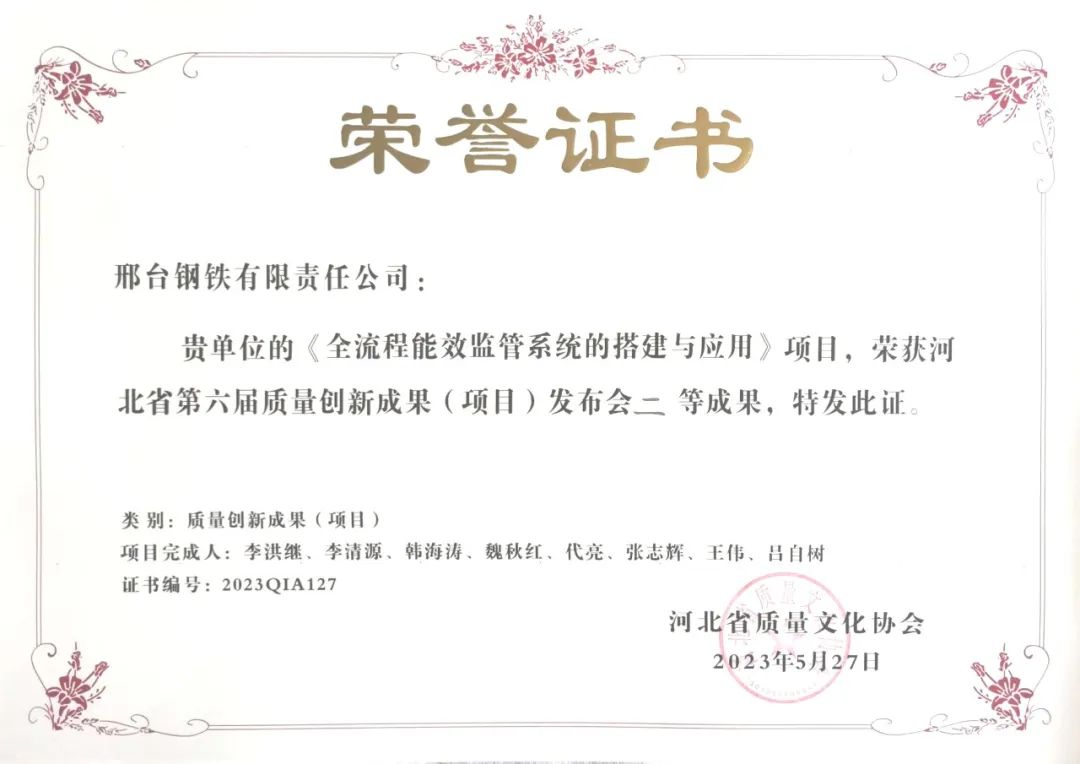 多年來,秉承“干成事”的核心價值觀,積極踐行特鋼精品戰(zhàn)略,邢鋼在轉(zhuǎn)型升級的高質(zhì)量發(fā)展過程中,走出了一條創(chuàng)新型標桿道路。作為河北省質(zhì)量文化協(xié)會會員單位,邢鋼已連續(xù)多年應邀參加“河北省質(zhì)量創(chuàng)新成果發(fā)布會”,截至目前,邢鋼已經(jīng)累計榮獲河北省質(zhì)量創(chuàng)新示范級成果12項、專業(yè)級成果11項、改進級成果5項。