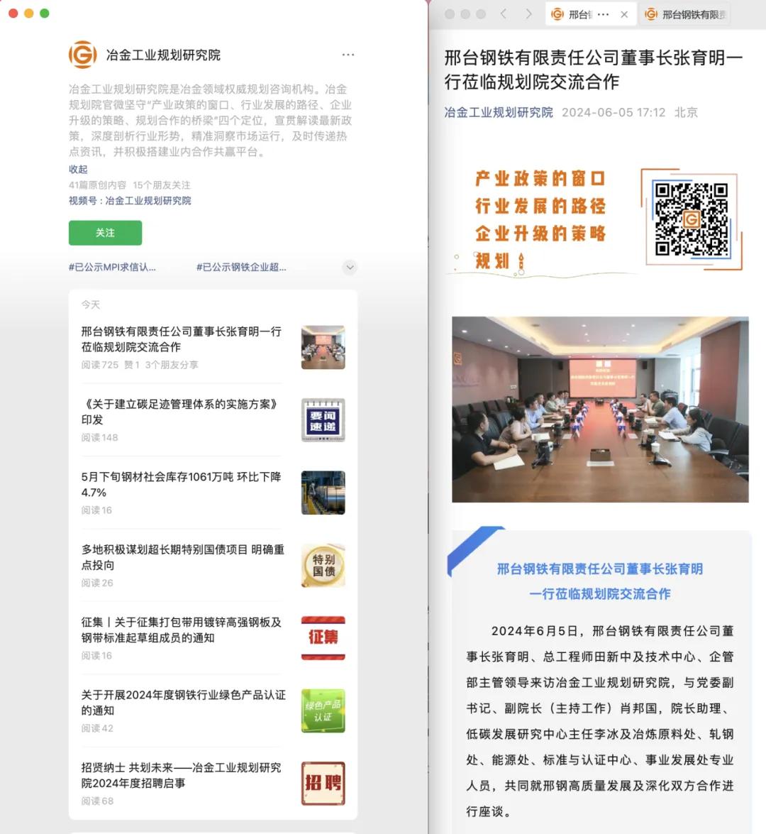 張育明董事長(zhǎng)希望雙方能夠在持續(xù)深入的接觸與合作中,不斷加深認(rèn)知、增進(jìn)友誼。邢鋼與冶金規(guī)劃院深化交流與合作,將助力企業(yè)準(zhǔn)確把握政策導(dǎo)向和行業(yè)形勢(shì),對(duì)標(biāo)先進(jìn)深挖內(nèi)潛,厚植高質(zhì)量發(fā)展根基,提高精品特鋼差異化競(jìng)爭(zhēng)力,致力建成以短流程為特色,以“開(kāi)放、智慧、綠色、靈動(dòng)、融合”為標(biāo)志的國(guó)際一流特鋼長(zhǎng)材標(biāo)桿企業(yè)。