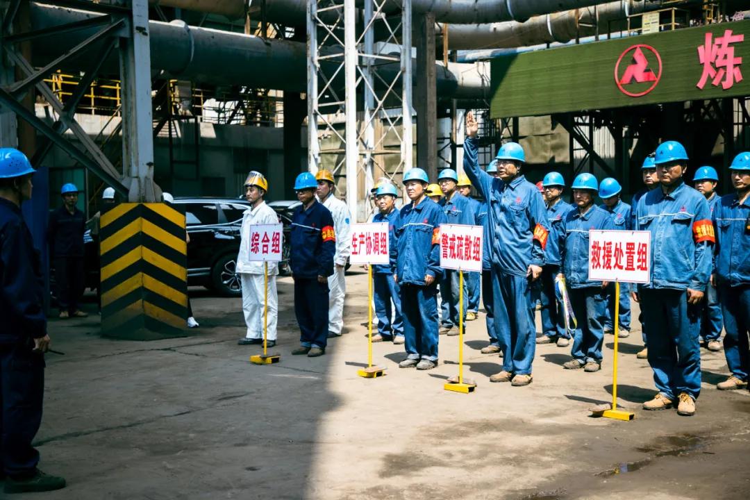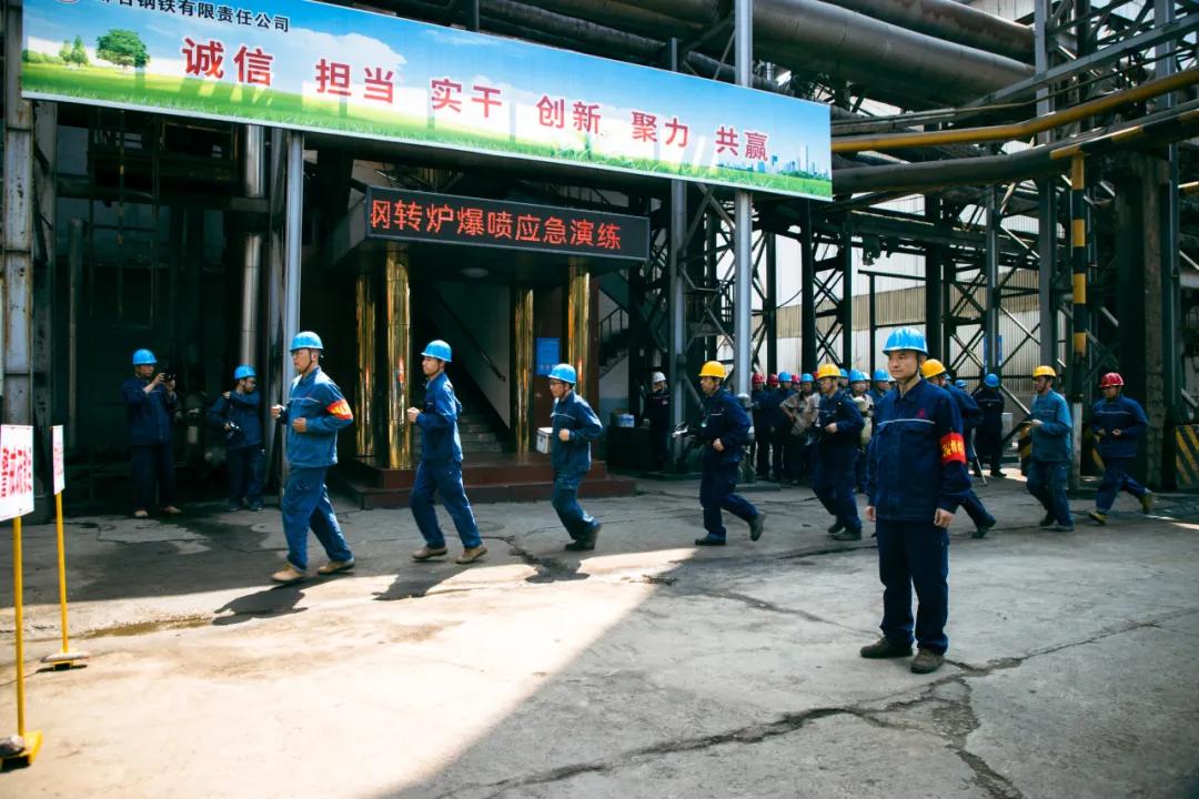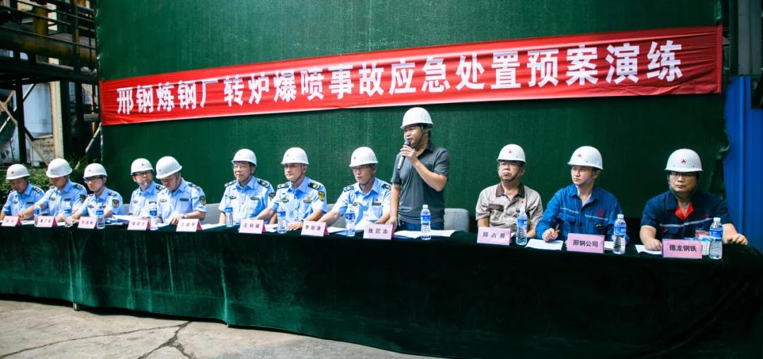 隨后,參會(huì)人員一起現(xiàn)場(chǎng)觀摩了邢鋼高溫熔融金屬爆噴事故現(xiàn)場(chǎng)應(yīng)急處置演練。本次演練,模擬煉鋼廠加料跨天車向2#轉(zhuǎn)爐加廢鋼時(shí)發(fā)生爆噴為背景,演示了事故上報(bào)、安全疏散、預(yù)案啟動(dòng)、現(xiàn)場(chǎng)搶險(xiǎn)、應(yīng)急救援等環(huán)節(jié)。