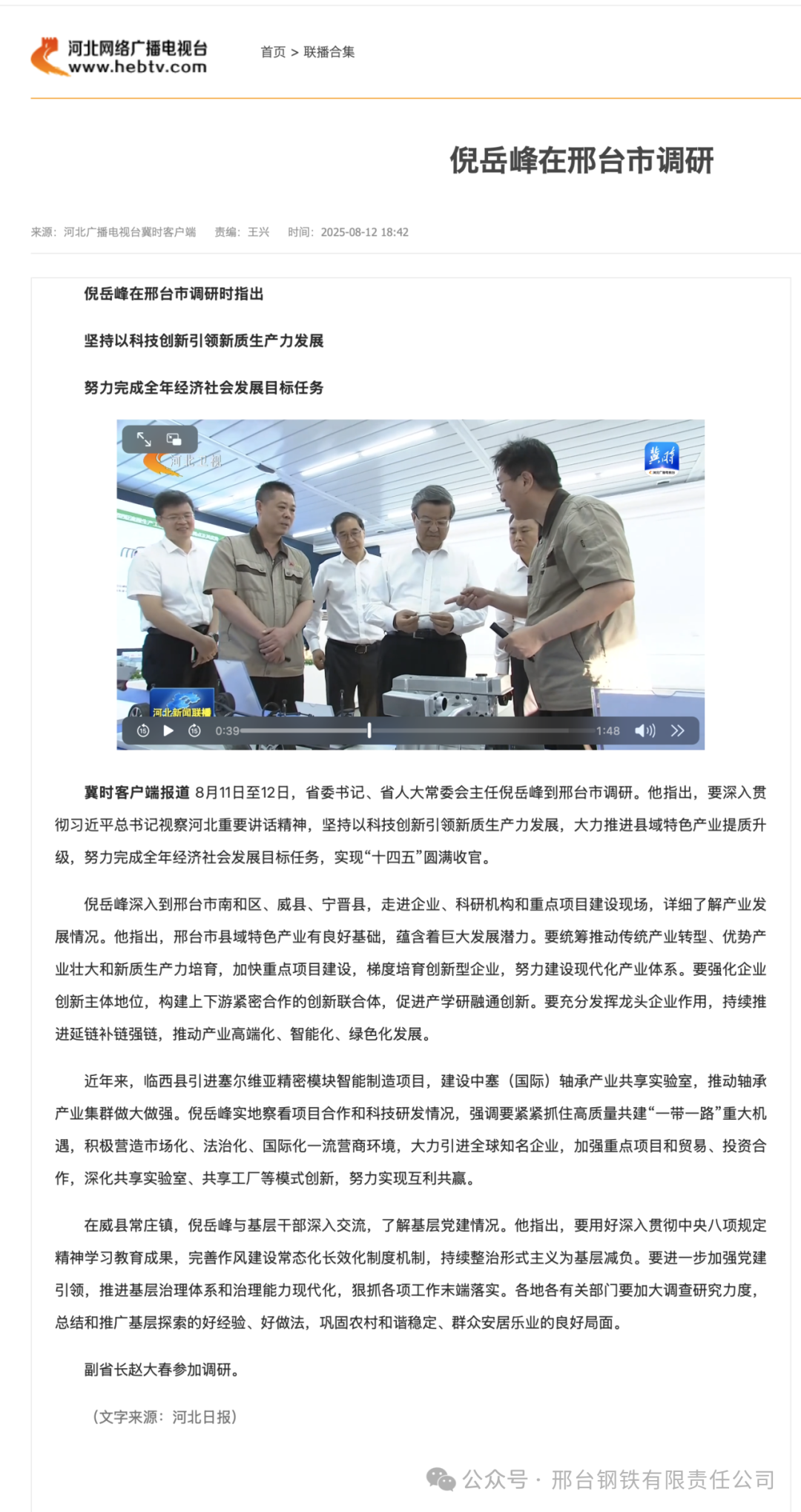 冀時客戶端報道 8月11日至12日,省委書記、省人大常委會主任倪岳峰到邢臺市調研。他指出,要深入貫徹習近平總書記視察河北重要講話精神,堅持以科技創(chuàng)新引領新質生產力發(fā)展,大力推進縣域特色產業(yè)提質升級,努力完成全年經濟社會發(fā)展目標任務,實現“十四五”圓滿收官。