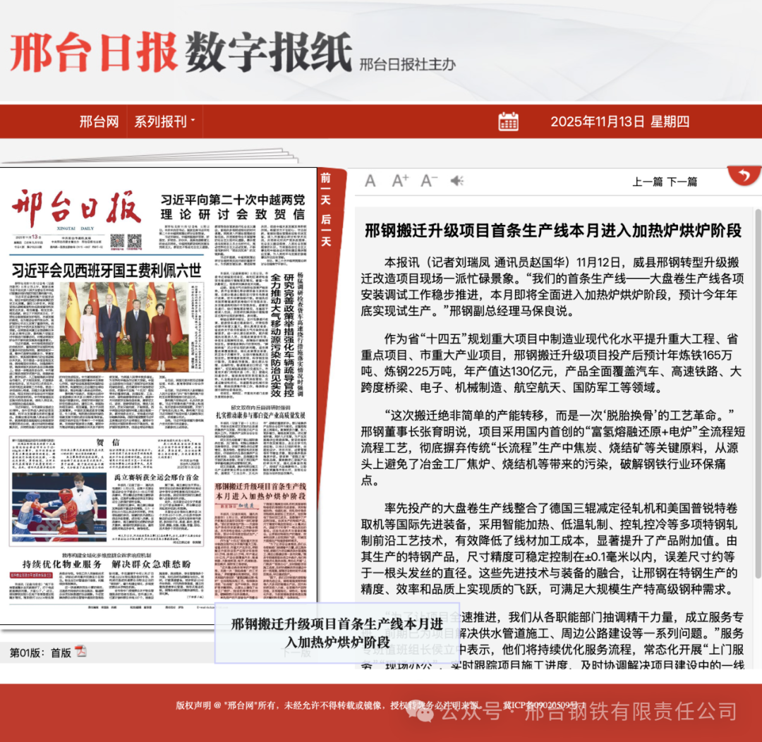 率先投產(chǎn)的大盤(pán)卷生產(chǎn)線整合了德國(guó)三輥減定徑軋機(jī)和美國(guó)普銳特卷取機(jī)等國(guó)際先進(jìn)裝備,采用智能加熱、低溫軋制、控軋控冷等多項(xiàng)特鋼軋制前沿工藝技術(shù),有效降低了線材加工成本,顯著提升了產(chǎn)品附加值。由其生產(chǎn)的特鋼產(chǎn)品,尺寸精度可穩(wěn)定控制在±0.1毫米以?xún)?nèi),誤差尺寸約等于一根頭發(fā)絲的直徑。這些先進(jìn)技術(shù)與裝備的融合,讓邢鋼在特鋼生產(chǎn)的精度、效率和品質(zhì)上實(shí)現(xiàn)質(zhì)的飛躍,可滿足大規(guī)模生產(chǎn)特高級(jí)鋼種需求。“為了讓項(xiàng)目全速推進(jìn),我們從各職能部門(mén)抽調(diào)精干力量,成立服務(wù)專(zhuān)班,前期已為項(xiàng)目解決供水管道施工、周邊公路建設(shè)等一系列問(wèn)題。”服務(wù)專(zhuān)班值班組長(zhǎng)侯立中表示,他們將持續(xù)優(yōu)化服務(wù)流程,常態(tài)化開(kāi)展“上門(mén)服務(wù)”“現(xiàn)場(chǎng)辦公”,實(shí)時(shí)跟蹤項(xiàng)目施工進(jìn)度,及時(shí)協(xié)調(diào)解決項(xiàng)目建設(shè)中的一線難題,保障項(xiàng)目按時(shí)間節(jié)點(diǎn)高效推進(jìn),早日建成投產(chǎn)。“眼下,我們正對(duì)標(biāo)國(guó)內(nèi)首鋼智新等先進(jìn)企業(yè),瞄準(zhǔn)高強(qiáng)度耐熱鋼等八大系列的高精尖產(chǎn)品,加大科技研發(fā)投入力度,全面提升產(chǎn)品附加值,實(shí)現(xiàn)高端化、綠色化、智能化升級(jí),為我國(guó)高端裝備制造業(yè)提供關(guān)鍵材料支撐。”馬保良說(shuō)。