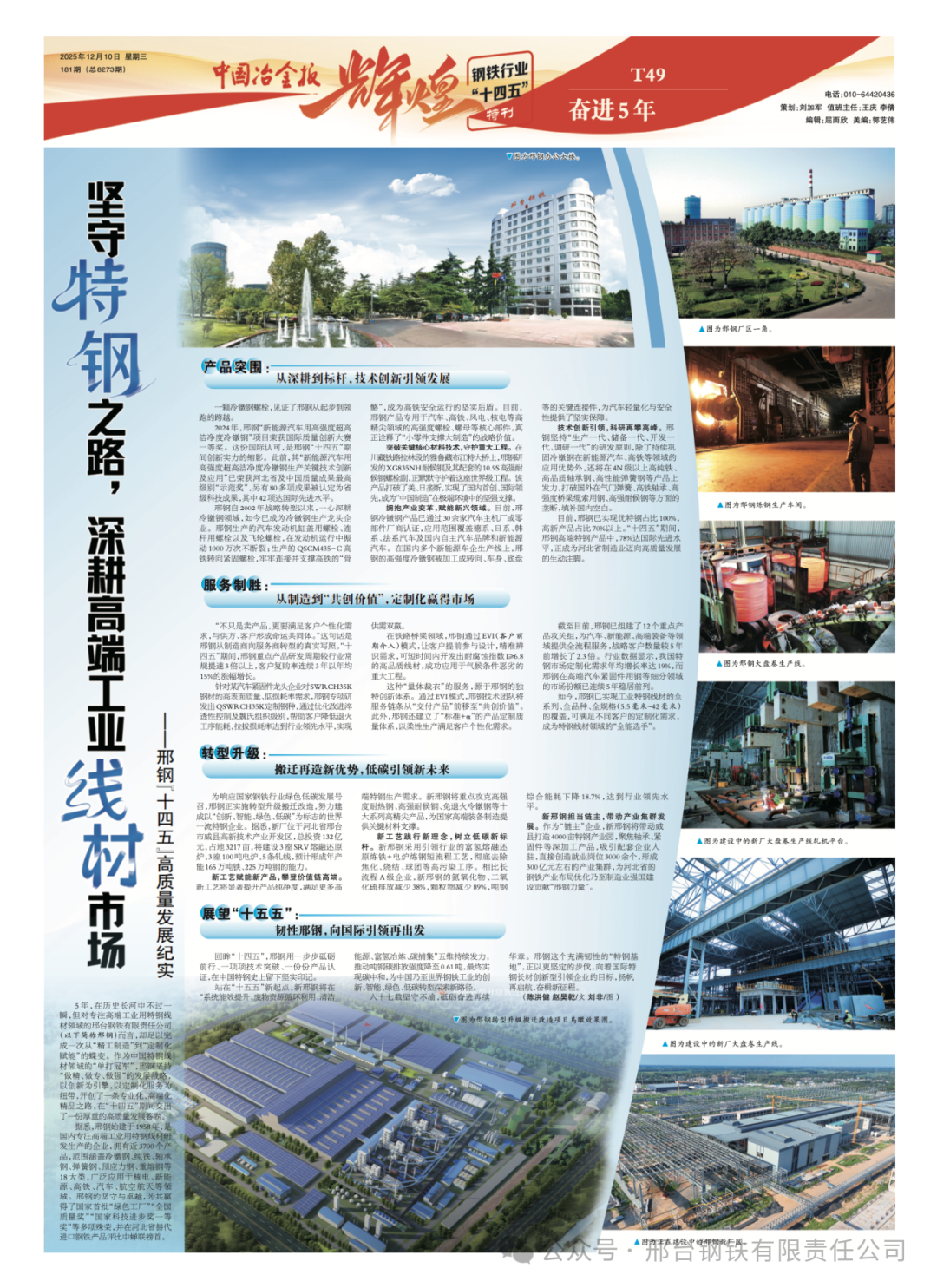 5年,在歷史長(zhǎng)河中不過(guò)一瞬,但對(duì)專注高端工業(yè)用特鋼線材領(lǐng)域的邢臺(tái)鋼鐵有限責(zé)任公司(以下簡(jiǎn)稱邢鋼)而言,卻足以完成一次從“精工制造”到“定制化賦能”的蝶變。作為中國(guó)特鋼線材領(lǐng)域的“單打冠軍”,邢鋼堅(jiān)持“做精、做專、做強(qiáng)”的發(fā)展戰(zhàn)略,以創(chuàng)新為引擎,以定制化服務(wù)為紐帶,開創(chuàng)了一條專業(yè)化、高端化精品之路,在“十四五”期間交出了一份厚重的高質(zhì)量發(fā)展答卷。